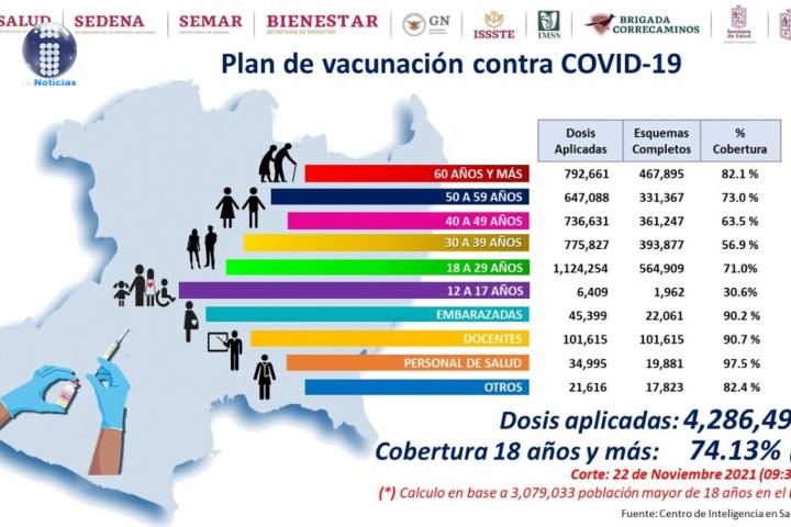 NOTICIAS 22/11/2021SSM ha aplicado más de un millón de dosis anti COVID-19 a población de 18 a 29 añosEn Michoacán se han aplicado un millón 124 mil 254 dosis de vacuna anti COVID-19 para jóvenes de 18 a 29 años de edad, lo que representa un avance del 71.04 por ciento en este grupo poblacional.