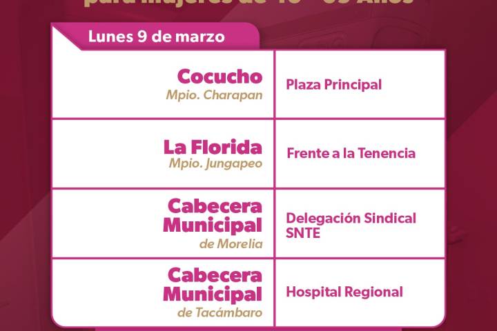 NOTICIAS 08/03/2026SSM llevará mastografías gratuitas a 9 municipios Del 9 al 13 de marzo, la Secretaría de Salud de Michoacán (SSM) llevará unidades móviles a nueve municipios del estado para realizar mastografías gratuitas a mujeres de 40 a 69 años, como parte de las acciones para la detección oportuna de cáncer de mama.