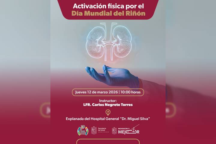 NOTICIAS 09/03/2026SSM promueve la activación física en el Día Mundial del RiñónLa Secretaría de Salud de Michoacán (SSM) invita a la población general y al personal de salud a participar en la Jornada de Activación Física por el Día Mundial del Riñón, como parte de las acciones para fomentar estilos de vida saludables y prevenir enfermedades crónico-degenerativas.