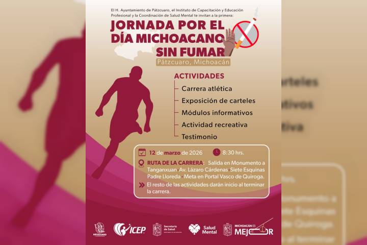 NOTICIAS 10/03/2026SSM realizará carrera atlética para fomentar entornos libres de humo en PátzcuaroCon el objetivo de fomentar entornos libres de humo y proteger la salud juvenil, la Secretaría de Salud de Michoacán (SSM), a través de la Coordinación de Salud Mental, llevará a cabo una carrera atlética. Esta actividad forma parte de la jornada integral por el Día Michoacano sin Fumar, realizada en coordinación con el Ayuntamiento de Pátzcuaro y el Instituto de Capacitación y Educación Profesional (ICEP).