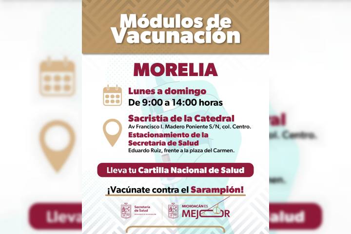 NOTICIAS 11/03/2026SSM instala módulos de vacunación para mantener la protección de las familias La Secretaría de Salud de Michoacán (SSM) instaló dos módulos de vacunación en el Centro Histórico de Morelia, con el objetivo de garantizar el acceso gratuito a la salud y no interrumpir la protección de las familias michoacanas.
