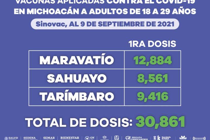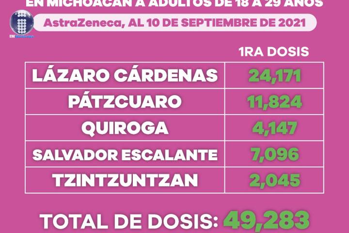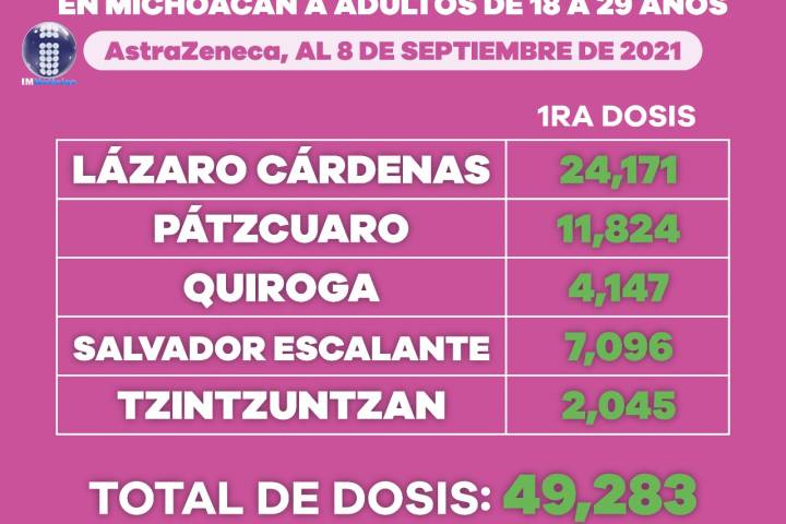De las dosis aplicadas, 49 mil 283 corresponden a AstraZeneca, 56 mil 930 a CanSino, 281 mil 087 a Pfizer y 30 mil 861 a Sinovac. Hoy se tienen módulos activos de inmunización para este sector de la población en Maravatío, Morelia y Pátzcuaro.