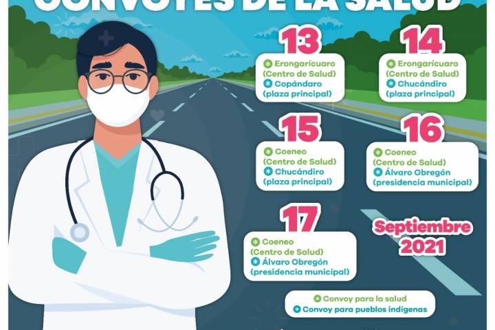 NOTICIAS 12/09/2021Convoyes de la salud y para pueblos indígenas de la SSM estarán en 5 municipios En la semana del 13 al 17 de septiembre, los convoyes para la salud y de Pueblos Indígenas de la Secretaría de Salud de Michoacán (SSM), otorgarán servicios gratuitos a la población de cinco municipios.