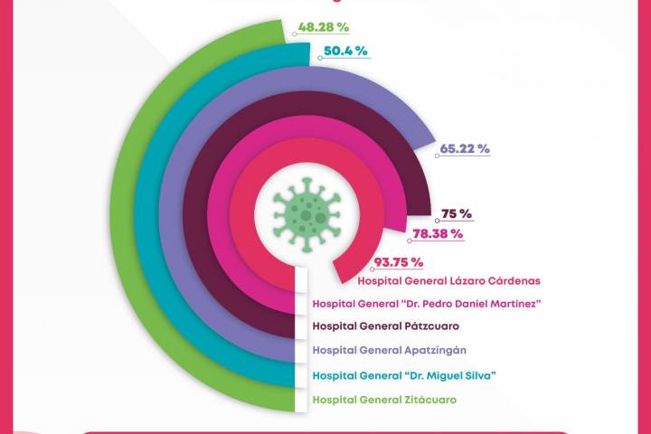 NOTICIAS 21/08/2021Unidades médicas de SSM registran ocupación COVID-19 del 48.28% a 93.75%Seis unidades médicas de la SecretarÃa de Salud de Michoacán (SSM), reconvertidas para la atención de Infecciones Respiratorias Agudas Graves (IRAG), registran alta demanda.