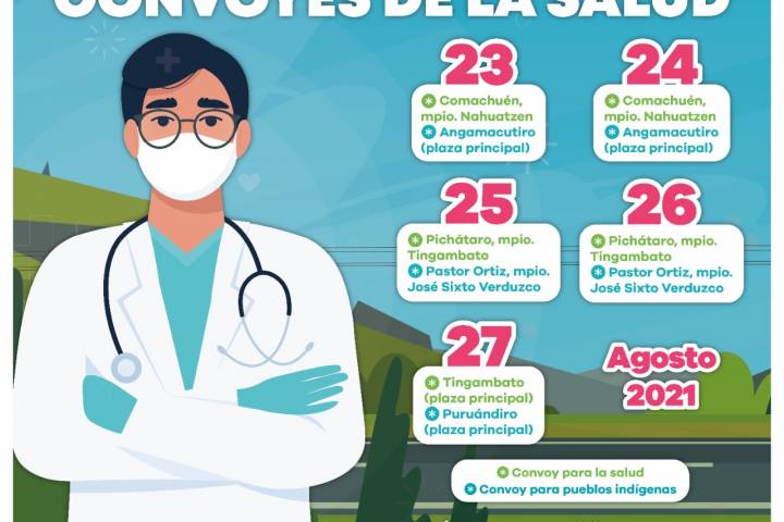 NOTICIAS 22/08/2021Recorrerán Convoyes de la Salud y de Pueblos IndÃgenas 6 municipiosLa SecretarÃa de Salud de Michoacán (SSM), informa a la población sobre los lugares en los que se encontrarán los Convoyes de Salud y para Pueblos IndÃgenas, del 23 al 27 de agosto.