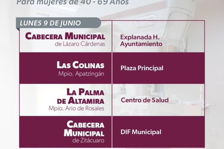 NOTICIAS 08/06/2025Mastografías gratuitas llegan a 7 municipios con unidades móviles: SSM A partir del lunes 9 de junio, la Secretaría de Salud de Michoacán (SSM) desplegará cuatro unidades móviles a siete municipios de la entidad, para realizar mastografías gratuitas a mujeres de 40 a 69 años.
