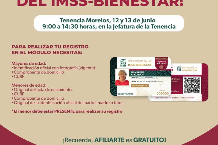 NOTICIAS 11/06/2025Jornada de credencialización IMSS Bienestar en Tenencia Morelos La Secretaría de Salud de Michoacán (SSM), en coordinación con el IMSS Bienestar invitan a la población de Tenencia Morelos, municipio de Morelia, a participar en la jornada de credencialización que se llevará a cabo los días 12 y 13 de junio, para facilitar el acceso a servicios de salud gratuitos para personas que no cuentan con seguridad social.