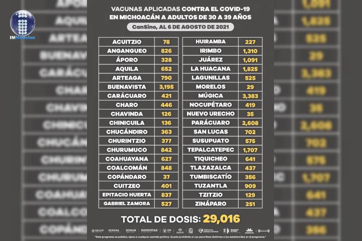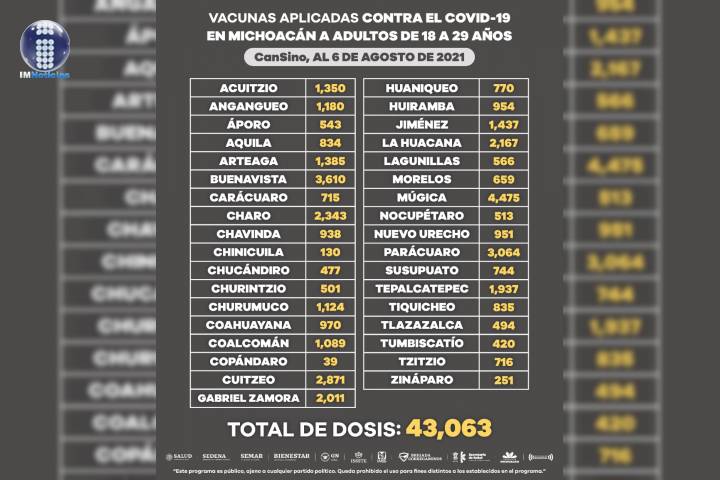 En los municipios de Lázaro Cárdenas, Uruapan y Zitácuaro se ha logrado aplicar 46 mil 552 dosis de Pfizer; mientras que, en Acuitzio, Briseñas, Charapan, Cherán, Hidalgo, Huandacareo, Pátzcuaro, Tarímbaro, Tocumbo y Zinapécuaro, se han aplicado 103 mil 891 de AstraZeneca.