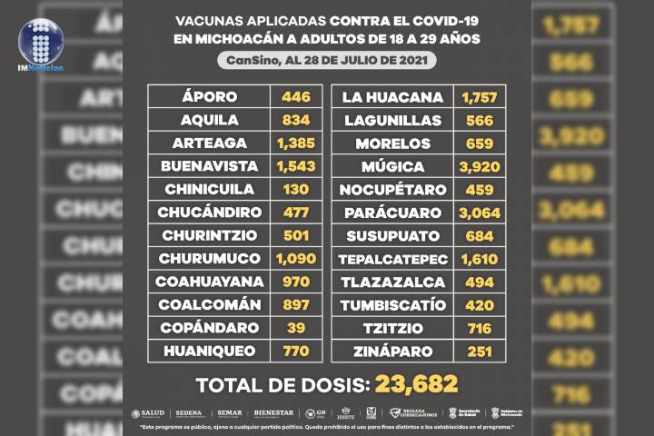 NOTICIAS 28/07/2021Aplicadas, 23 mil 682 dosis a personas de 18 a 29 añosLa vacunación contra COVID-19 a personas de 18 a 29 años de edad, registra hasta la fecha 23 mil 682 dosis aplicadas en varios municipios de la entidad, informa la SecretarÃa de Salud de Michoacán (SSM).