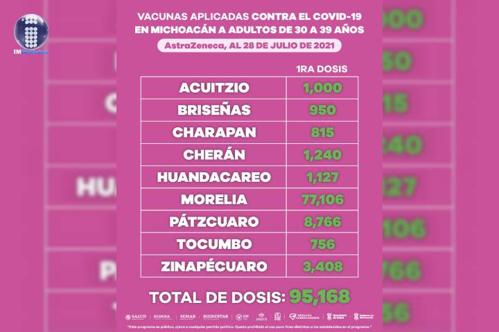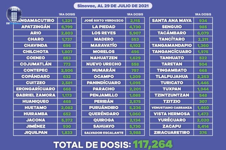 Se han aplicado 105 mil 287 primera dosis de Sinovac en 48 localidades y 95 mil 168 de AstraZeneca en Acutzio, Briseñas, Charapan, Cherán, Huandacareo, Morelia, Pátzcuaro, Tocumbo y Zinapécuaro.