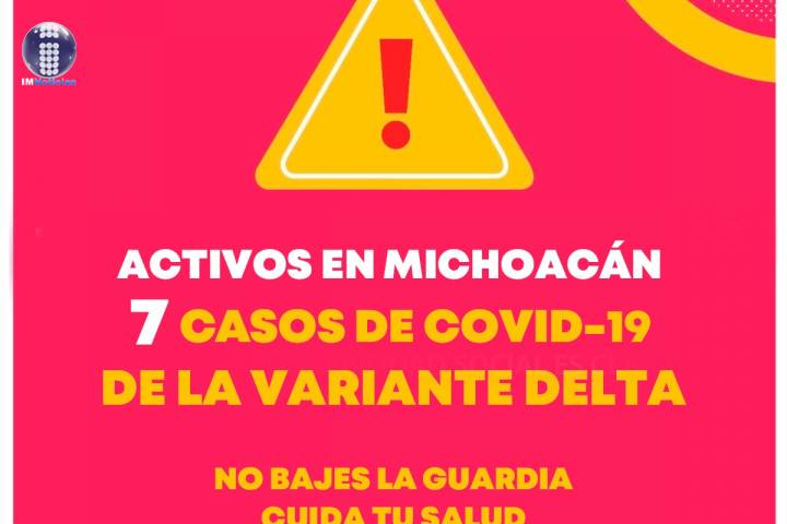 NOTICIAS 30/07/2021Activos, 7 casos de variante Delta de COVID-19 en Michoacán La SecretarÃa de Salud de Michoacán (SSM), informa que, mediante los protocolos de estudio establecidos, se confirmaron 7 casos de COVID-19 positivos a la variante de preocupación Delta.