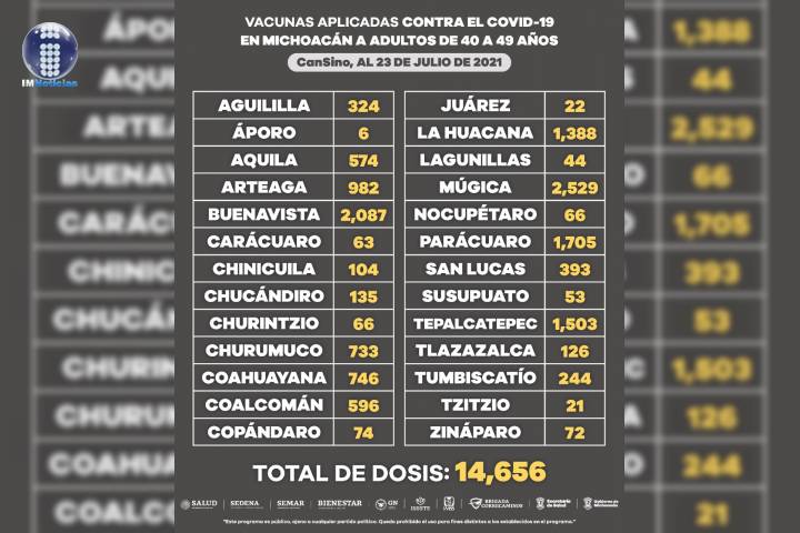 Los municipios que ya completaron esquema de vacunación con unidosis de CanSino fueron: Angangueo, Áporo, Aquila, Arteaga, Buena Vista, Carácuaro, Chinicuila, Cuchándiro, Churintzio, Churumuco, Coahuayana, Coalcomán, Copándaro, Epitacio Huerta, Irim... Ver más...