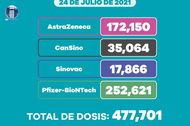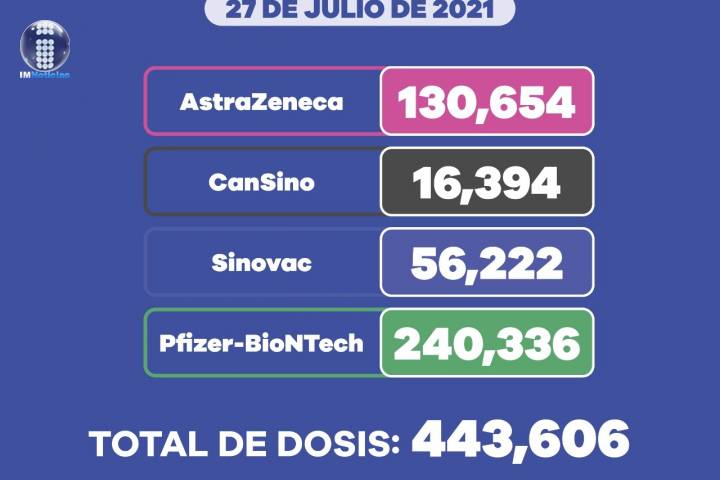 Del total del biológico aplicado, 130 mil 654 fueron de AstraZeneca; 16 mil 394 de CanSino; 56 mil 222 de Sinovac y 240 mil 336 de Pfizer.