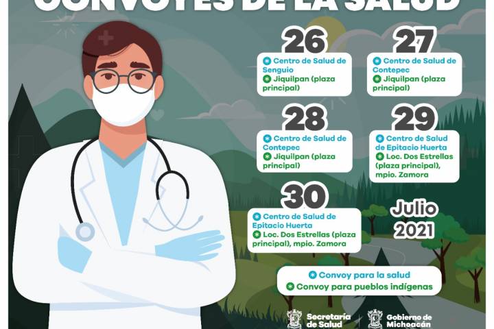 NOTICIAS 25/07/2021Garantizada la atención médica gratuita a través de los Convoyes de la Salud La Secretaría de Salud de Michoacán (SSM), garantiza la atención médica gratuita y por ello desplegará del 26 al 30 de julio los Convoyes de la Salud en cinco municipios.