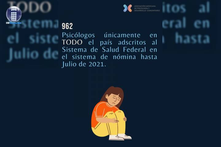 NOTICIAS 26/07/2021Solo hay 962 psicólogos para atender la salud mental en el paísMéxico es un país desatendido por parte de las autoridades en el tema de la salud mental, ya que son apenas 962 psicólogos los que laboran en el sector salud a nivel federal, según información de la Secretaría de Salud de México en respuesta a una solicitud de información.
