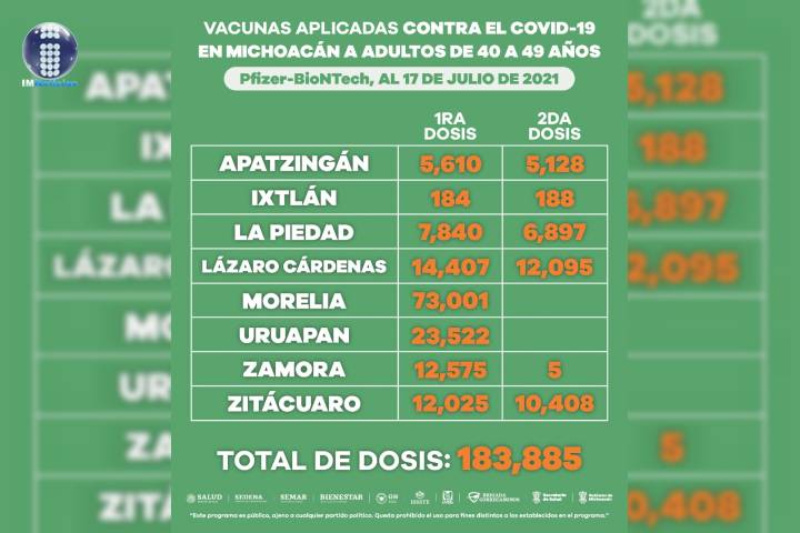 NOTICIAS 17/07/2021Aplicadas 368 mil 034 dosis a personas de 40 a 49 años En la entidad se han aplicado 368 mil 034 dosis de la vacuna anti-COVID-19 a personas de entre 40 y 49 años de edad, informó la Secretaría de Salud de Michoacán (SSM).