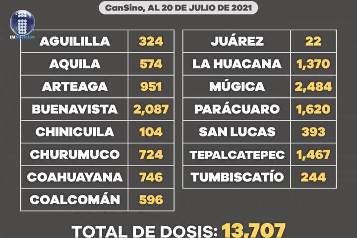 Del total de vacunas aplicadas hasta el día de hoy, 88 mil 20 pertenecen a la farmacéutica Sinovac, la cual benefició a los habitantes de Ario, Charo, Cherán, Chilchota, Copándaro, Cuitzeo, Gabriel Zamora, Huaniqueo, Huetamo, Huiramba, Jacona, Jiménez, Jiquilpan, José Sixto Verduzco,... Ver más...