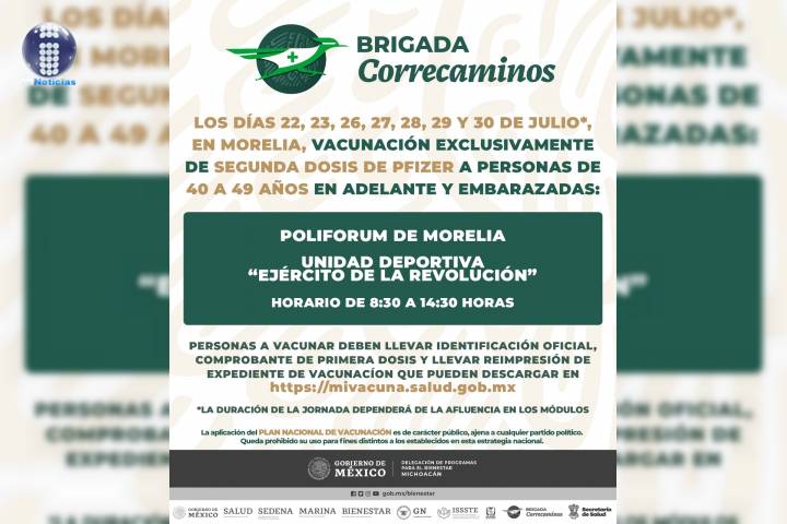 NOTICIAS 21/07/2021Este jueves inicia vacunación de segunda dosis de Pfizer en Morelia Este jueves 22 de julio iniciará la vacunación de las segundas dosis de Pfizer-BioNTech contra COVID-19 a personas de 40 a 49 años de edad y mujeres embarazadas, en Morelia.