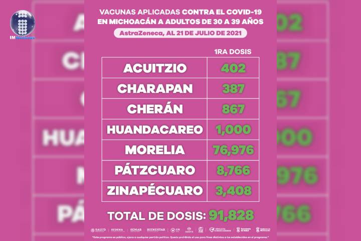 NOTICIAS 22/07/2021Avanza vacunación anti COVID-19 para personas de 30 a 39 años, en 73 municipios Hasta el momento, en Michoacán han sido aplicadas 201 mil 508 vacunas anti COVID-19, a personas de 30 a 39 años de edad, pertenecientes a 73 municipios.
