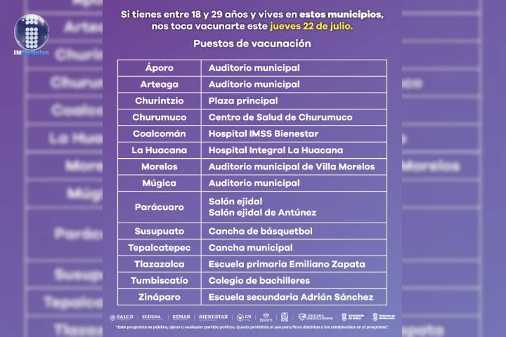NOTICIAS 21/07/2021Inicia vacunación a población de entre 18 y 29 años de edad, en 14 municipiosA partir del jueves 22 de julio, dará inicio la vacunación contra COVID-19 a población de entre 18 y 29 años de edad, en 14 municipios, informó la Secretaría de Salud de Michoacán (SSM).