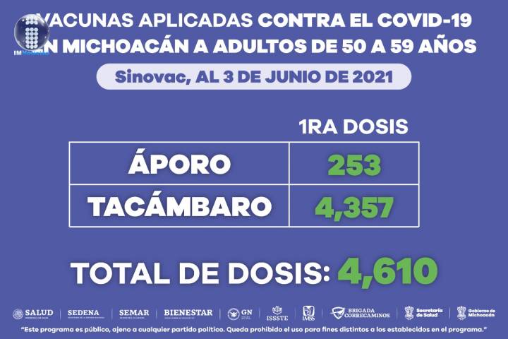 NOTICIAS 10/06/2021Aplicadas en Michoacán más de 302 mil dosis de anti COVID-19 a personas de 50 a 59 añosHasta la fecha han sido aplicadas en Michoacán 302 mil 616 vacunas anti COVID-19, a adultos de 50 a 59 años de edad.