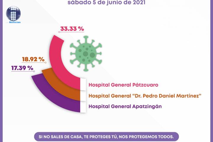 NOTICIAS 05/06/2021Pátzcuaro, Uruapan y Apatzingán, hospitales con mayor ocupación de camas COVID-19Los hospitales de la Secretaría de Salud de Michoacán (SSM), con camas reconvertidas para la atención de Infecciones Respiratorias Agudas Graves (IRAG), se encuentran por debajo del 40 por ciento en su ocupación.