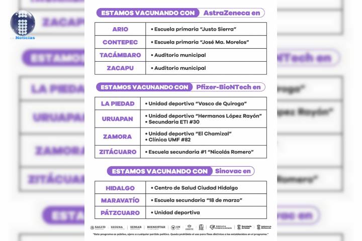 En Zitácuaro, Uruapan, La Piedad y Zamora se están aplicando segundas dosis de Pfizer a personas de 50 a 59 años.