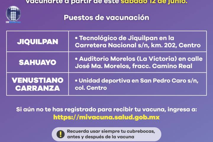 NOTICIAS 11/06/2021Este fin de semana, vacunación contra COVID-19 en Jiquilpan, Sahuayo y Venustiano CarranzaLa Secretaría de Salud de Michoacán (SSM), informa que este sábado 12 y domingo 13 de junio, habrá jornada de inmunización a personas de 40 a 49 años en los municipios de Jiquilpan, Sahuayo y Venustiano Carranza.