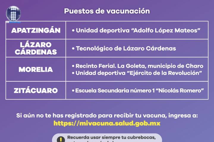 Los módulos de vacunación se activarán en los municipios de Ario, La Piedad, Puruándiro, Salvador Escalante, Turicato y Zitácuaro.