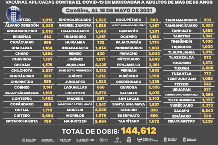 NOTICIAS 15/05/2021Suman más de 650 mil dosis de vacuna contra COVID-19 a adultos mayores de 60 años La Secretaría de Salud de Michoacán (SSM), informa que en la entidad se han aplicado 650 mil 628 dosis de vacunas contra COVID-19 a adultos mayores de 60 años.