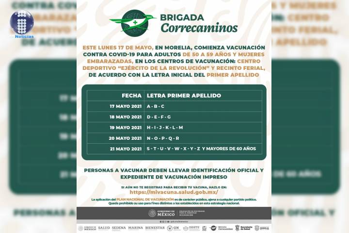 NOTICIAS 16/05/2021Este lunes inicia vacunación a personas de 50 a 59 años y embarazadas, en MoreliaEste lunes 17 de mayo, iniciará la vacunación contra COVID-19 a personas de 50 a 59 años de edad y mujeres embarazadas mayores de 18 años, en Morelia.