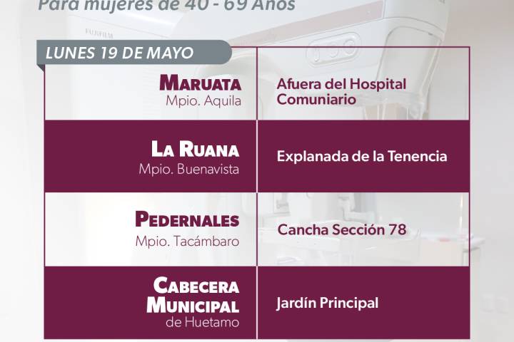 Del 19 al 23 de mayo recorrerán los municipios de Aquila, Buenavista, Huetamo, Tacámbaro y Lázaro Cárdenas para realizar estudios gratuitos de mama a ... Ver más...
