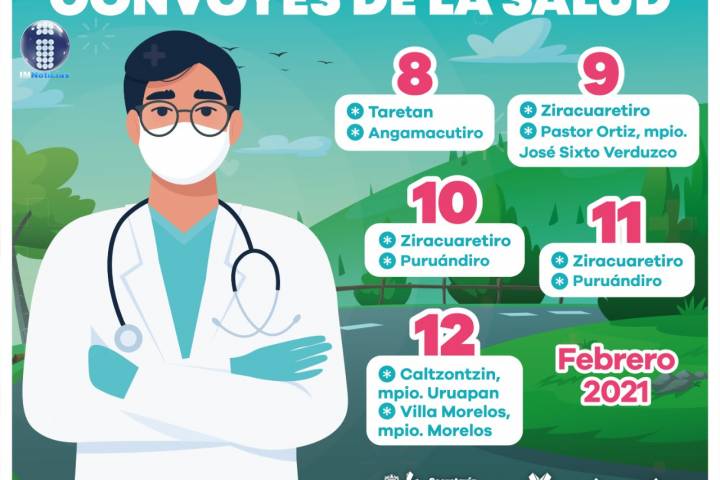NOTICIAS 07/02/2021Convoyes de la salud, recorrerán 7 municipios para brindar servicios gratuitos a la poblaciónLa Secretaría de Salud de Michoacán (SSM), recorrerá siete municipios con los Convoyes de la Salud, del 8 al 12 de enero, para brindar servicios médicos gratuitos a la población de comunidades alejadas.