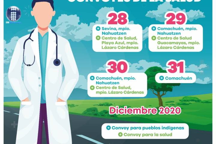 NOTICIAS 27/12/2020Brinda SSM servicios médicos gratuitos a través de Convoyes de la Salud y Pueblos Indígenas La Secretaría de Salud de Michoacán (SSM), informa a la población que los servicios médicos gratuitos que se brindan a través de los Convoyes de la Salud y Pueblos Indígenas continuarán operando de manera ordinaria durante fiestas decembrinas.