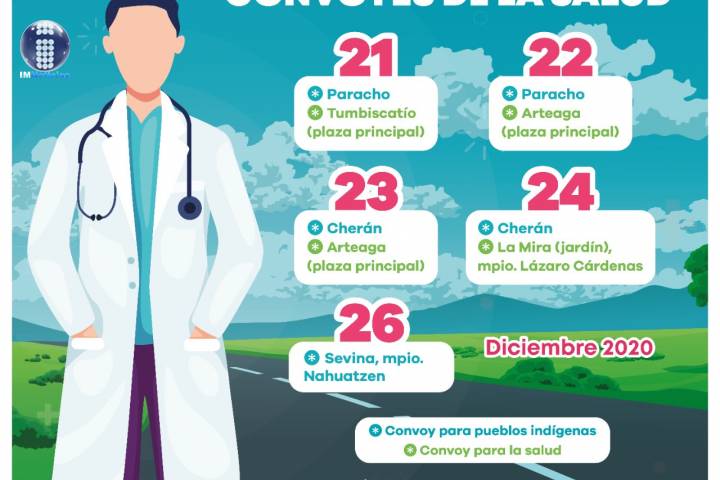 NOTICIAS 20/12/2020Servicios médicos gratuitos brinda SSM a través de Convoyes de la Salud y Pueblos Indígenas La Secretaría de Salud de Michoacán (SSM), informa a la población que los servicios médicos gratuitos que se brindan a través de los Convoyes de la Salud y Pueblos Indígenas continuarán operando de manera ordinaria durante fiestas decembrinas.