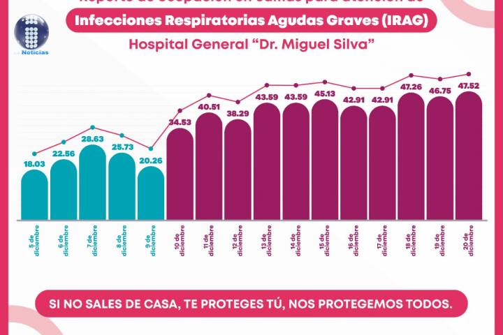 NOTICIAS 21/12/2020Registra Hospital Civil crecimiento sostenido de ocupación COVID-19 La Secretaría de Salud de Michoacán (SSM), informa que la ocupación de las camas reconvertidas para la atención de Infecciones Respiratorias Agudas Graves (IRAG), en el Hospital General "Dr. Miguel Silva", mantiene un incremento sostenido, pasando de un 18.03 por ciento apenas el pasado 5 de diciembre, a un 47.52 por ciento este domingo 20.