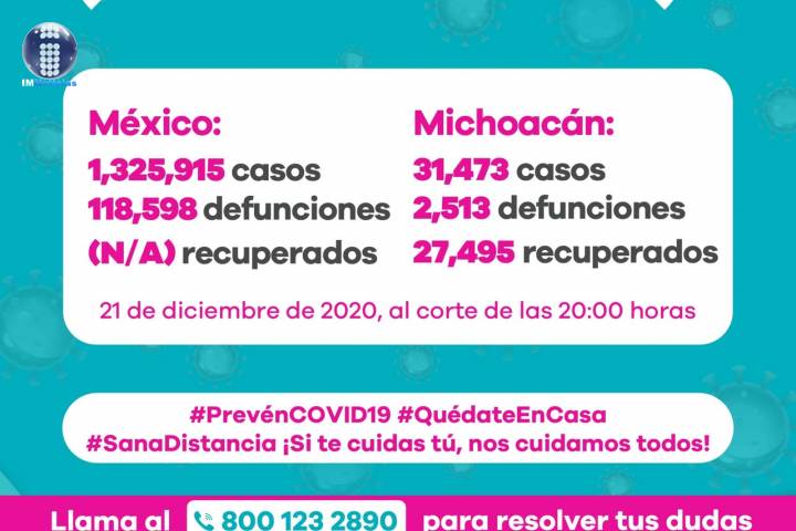 NOTICIAS 21/12/2020Ya son 2 mil 513 muertes por Covid-19 en Michoacán En la Unidad de Inteligencia Epidemiológica y Sanitaria (UIES) se han recibido un total de 74 mil 423 enfermos de vías respiratorias a descartar coronavirus, 41 mil 414 cumplieron con definición operacional resultando negativas a COVID-19, es decir, no tienen el virus.