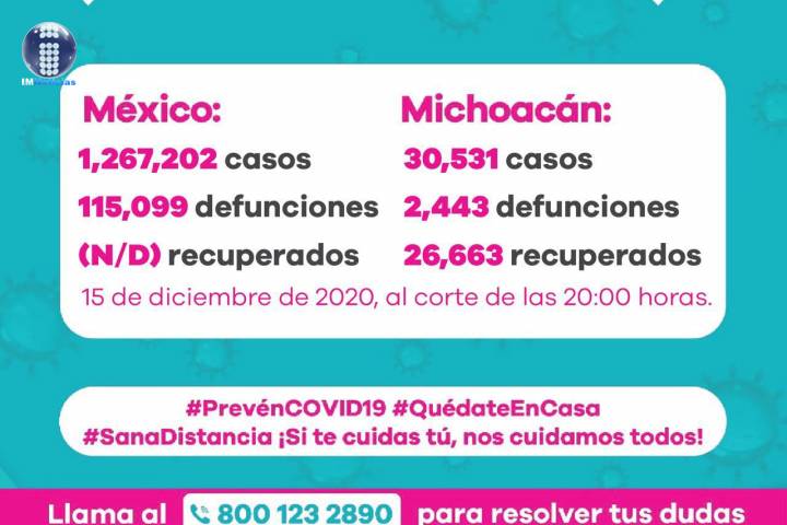 NOTICIAS 15/12/2020Tiene Michoacán 2 mil 443 fallecimientos por COVID-19 En la Unidad de Inteligencia Epidemiológica y Sanitaria (UIES) se han recibido un total de 72 mil 643 enfermos de vías respiratorias a descartar coronavirus, 40 mil 435 cumplieron con definición operacional resultando negativas a COVID-19, es decir, no tienen el virus.