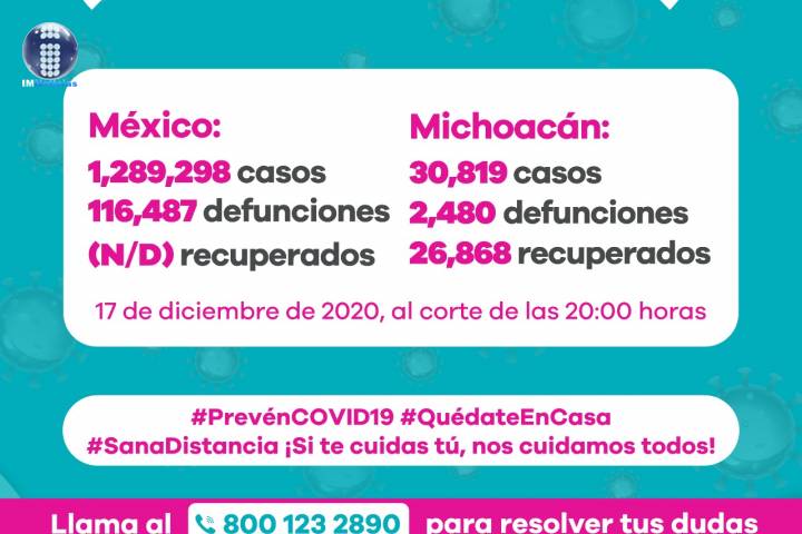 NOTICIAS 17/12/2020Suman 2 mil 480 defunciones por COVID-19 en Michoacán En la Unidad de Inteligencia Epidemiológica y Sanitaria (UIES) se han recibido un total de 73 mil 467 enfermos de vías respiratorias a descartar coronavirus, 40 mil 721 cumplieron con definición operacional resultando negativas a COVID-19, es decir, no tienen el virus.