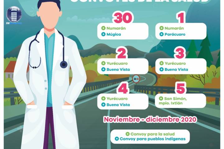 NOTICIAS 29/11/2020Acerca SSM servicios gratuitos a población de seis municipios a través de ConvoyesLa Secretaría de Salud de Michoacán (SSM), informa a la población sobre los lugares en los que se encontrarán los Convoyes de Salud y de Pueblos Indígenas, con los que se otorgan servicios gratuitos, del 30 de noviembre al 5 de diciembre.