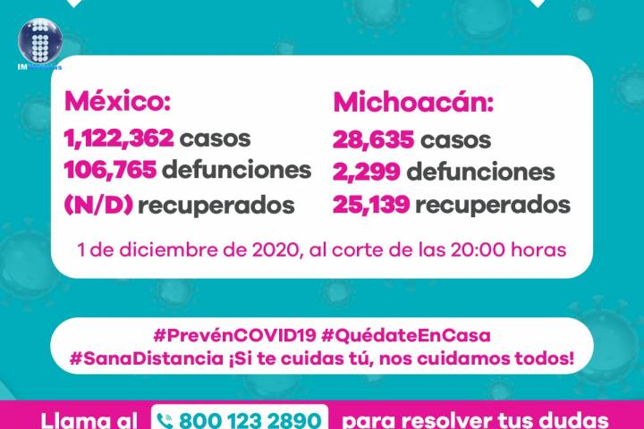 NOTICIAS 29/11/2020Tiene Michoacán 2 mil 284 defunciones por COVID-19 En la Unidad de Inteligencia Epidemiológica y Sanitaria (UIES), se han recibido un total de 67 mil 946 de enfermos de vías respiratorias a descartar coronavirus, 37 mil 949 cumplieron con definición operacional resultando negativas a COVID-19, es decir, no tienen el virus.
