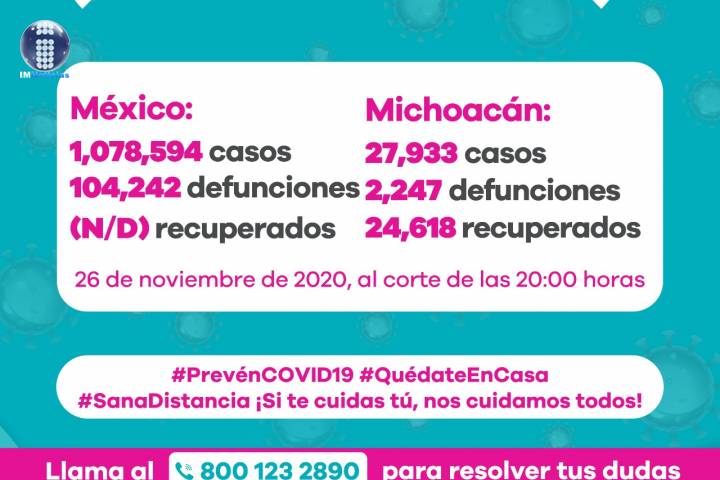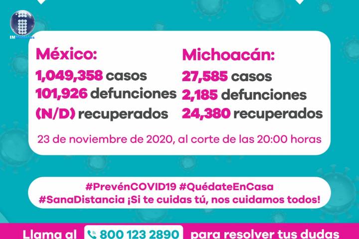 NOTICIAS 23/11/2020Ya son 2 mil 185 muertes por Covid-19 en Michoacán En la Unidad de Inteligencia Epidemiológica y Sanitaria (UIES), se han recibido un total de 65 mil 956 de enfermos de vÃas respiratorias a descartar coronavirus, 36 mil 951 cumplieron con definición operacional resultando negativas a COVID-19, es decir, no tienen el virus.