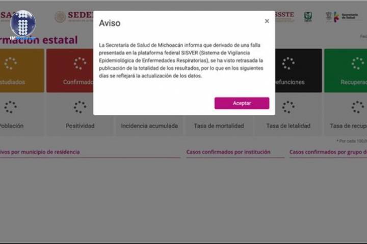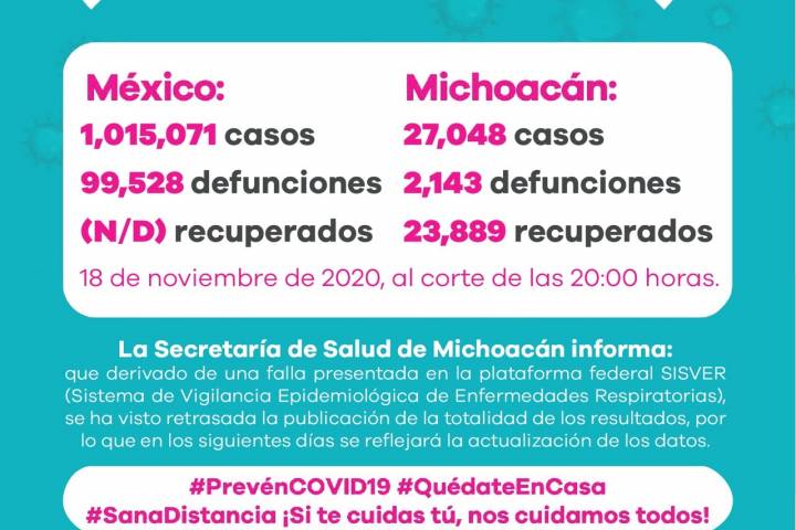 NOTICIAS 18/11/2020Falla en plataforma retrasa publicación de casos de COVID-19: SSMLa Secretaría de Salud de Michoacán (SSM), informa que derivado de una falla presentada en la plataforma federal Sistema de Vigilancia Epidemiológica de Enfermedades Respiratorias, (SISVER) se ha visto retrasada la publicación de la totalidad de los resultados de casos positivos de COVID-19 en la entidad.