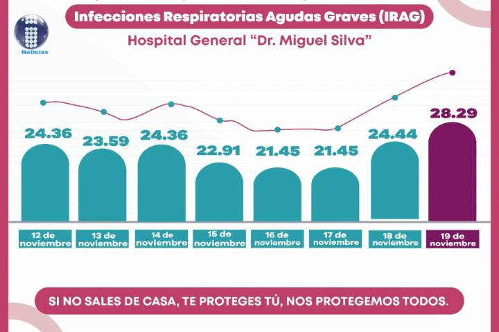 NOTICIAS 20/11/2020Registra Hospital Civil nuevo repunte de ocupación en camas COVID-19La Secretaría de Salud de Michoacán (SSM), informa que, la ocupación de las camas para la atención de Infecciones Respiratorias Agudas Graves (IRAG) en el Hospital General "Dr. Miguel Silva" de Morelia registró un nuevo repunte al 28.29 por ciento este jueves.