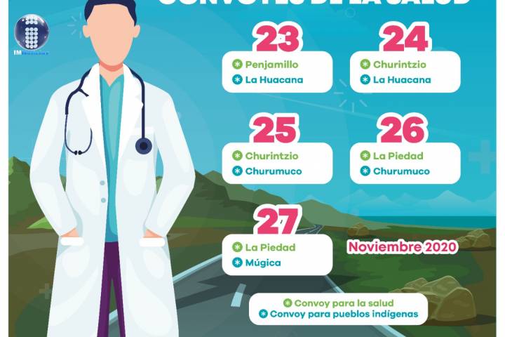 NOTICIAS 22/11/2020Desplegará SSM Convoyes de la Salud en 6 municipiosLa Secretaría de Salud de Michoacán (SSM), desplegará los Convoyes de la Salud y de Pueblos Indígenas a 6 municipios para llevar servicios gratuitos, del 23 al 27 de noviembre.