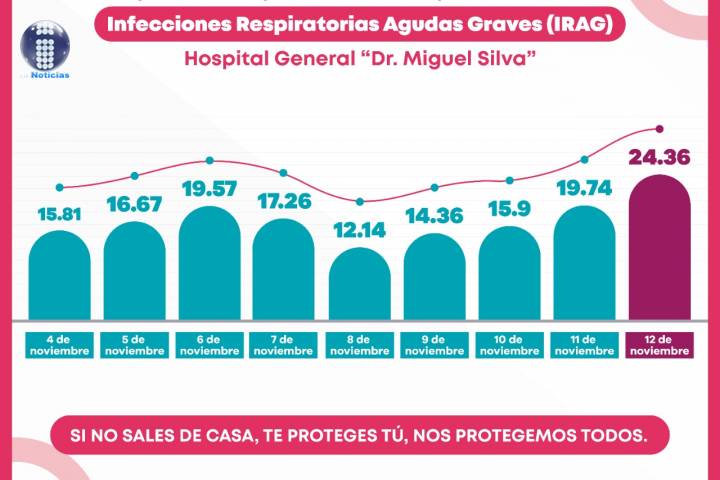 NOTICIAS 13/11/2020Incrementa ocupación COVID-19 en Hospital CivilDespués de mantener una ocupación por debajo del 20 por ciento desde el 4 de noviembre, este jueves las camas reconvertidas para la atención de Infecciones Respiratorias Agudas Graves (IRAG), en el Hospital General "Dr. Miguel Silva" registraron un incremento del 24.36 por ciento.