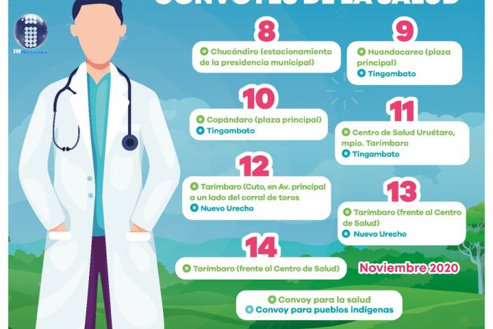 NOTICIAS 08/11/2020Serán atendidos 6 municipios a través de Convoyes de la Salud La Secretaría de Salud de Michoacán (SSM), acercará servicios de salud gratuitos a 6 municipios, a través de los Convoyes de Salud y de Pueblos Indígenas, del 8 al 14 de noviembre.