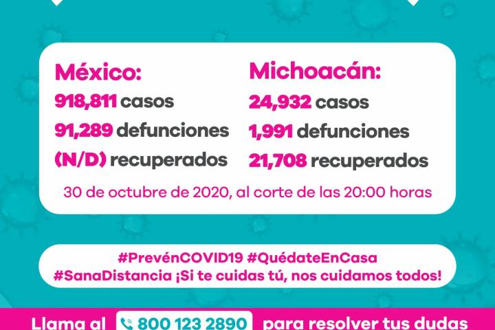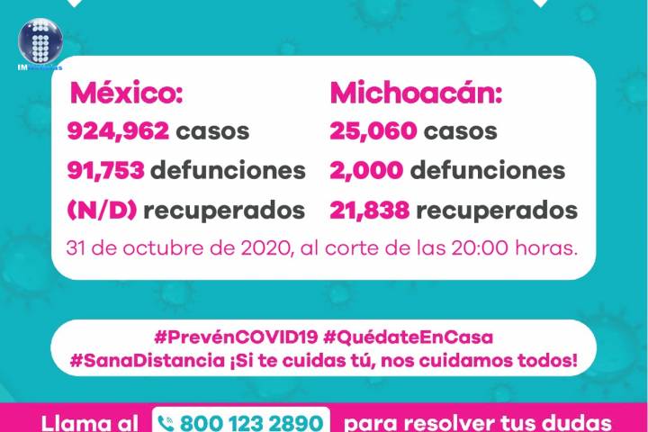 NOTICIAS 31/10/2020Suman 1991 defunciones por COVID-19 en Michoacán En la Unidad de Inteligencia Epidemiológica y Sanitaria (UIES), se han recibido un total de 60 mil 182 notificaciones de enfermos de vías respiratorias a descartar coronavirus, 33 mil 649 cumplieron con definición operacional resultando negativas a COVID-19, es decir, no tienen el virus.