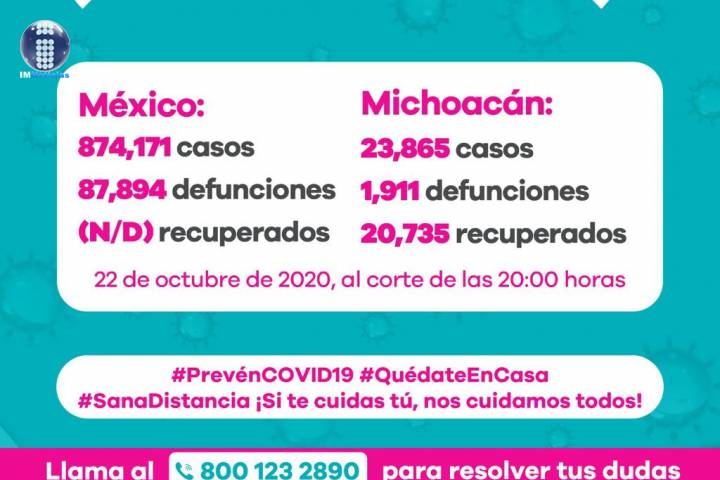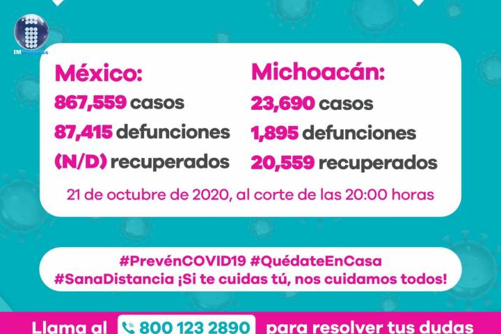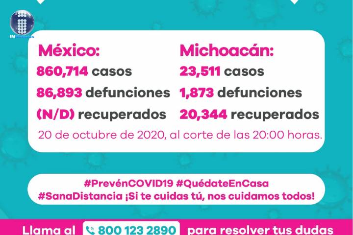 NOTICIAS 20/10/2020Se eleva a 1873 defunciones por COVID-19 en MichoacánEn la Unidad de Inteligencia Epidemiológica y Sanitaria (UIES), se han recibido un total de 55 mil 847 notificaciones de enfermos de vías respiratorias a descartar coronavirus, 31 mil 74 cumplieron con definición operacional resultando negativas a COVID-19, es decir, no tienen el virus.