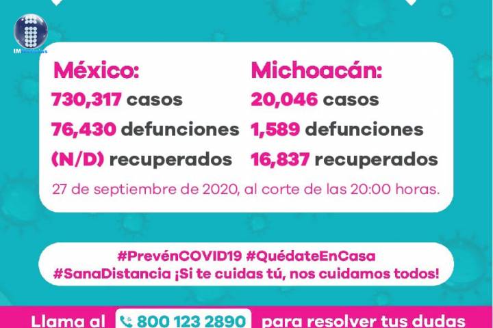 NOTICIAS 27/09/2020Ya son 1589 muertes por Covid-19 en Michoacán En la Unidad de Inteligencia Epidemiológica y Sanitaria (UIES), se han recibido un total de 48 mil 568 notificaciones de enfermos de vías respiratorias a descartar coronavirus, 26 mil 642 cumplieron con definición operacional resultando negativas a COVID-19, es decir, no tienen el virus.